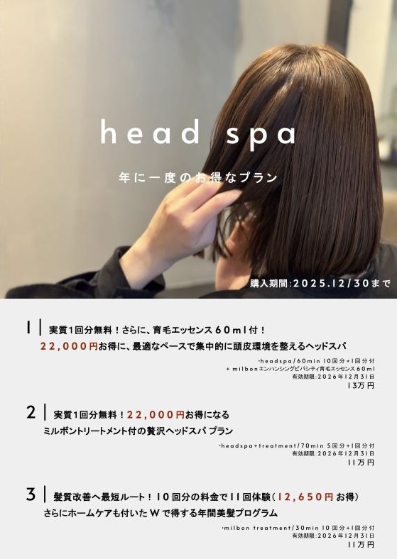 「ヘッドスパ」と「トリートメント」、「ヘッドスパトリートメント」の3つのプランをご用意しました